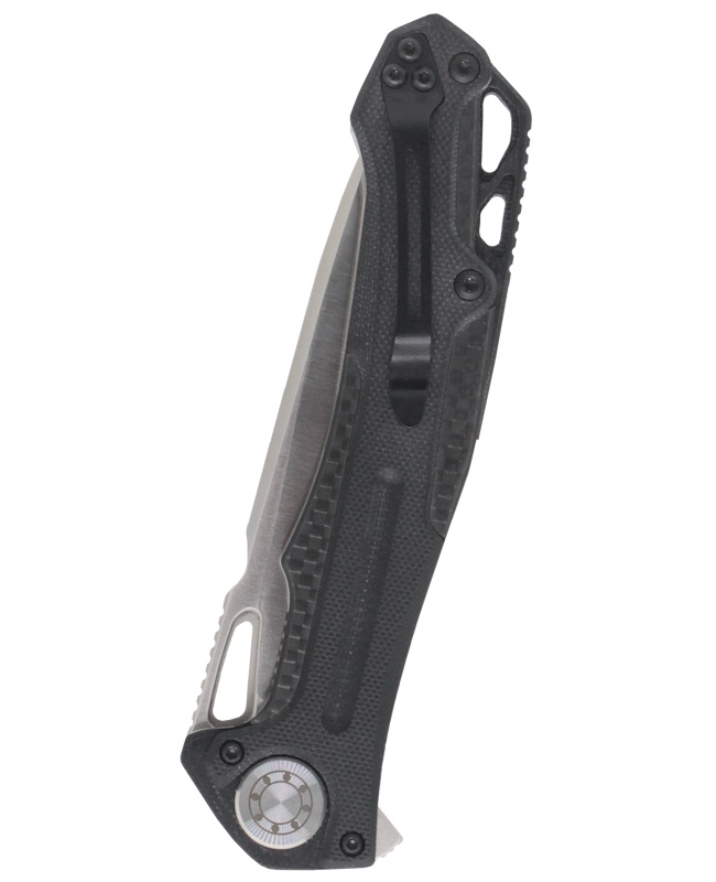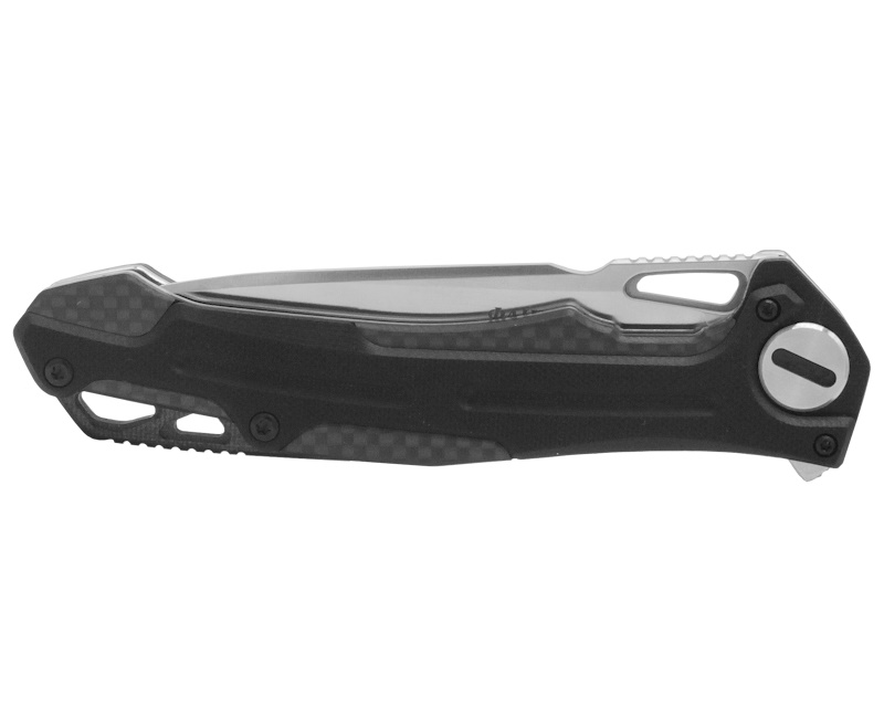 Современный дизайн ножа в техно-стиле, заданный элегантным клинком, продолжает рукоять. Она образована двухслойными текстурированными накладками: нижний слой - карбон, верхний слой – стеклопластик G10, материала, который отличается долговечностью, устойчив к механическим повреждениям и температурным воздействиям. Замок типа liner-lock с запирающей пластиной толщиной 2 мм обеспечивает надежную фиксацию клинка. Обратите внимание, что рукоять немного удлинена для комфортной работы в перчатках. Дополнительную жесткость и прочность рукояти придает проставка-спейсер из G10 черного цвета, в задней части которой имеется двойное темлячное отверстие, что способствует дополнительным возможностям по креплению темляков, страховочных шнуров или тренчиков. Благодаря установленной упругой клипсе «Фантом» удобно носить в кармане, а при необходимости легко извлечь. Его вполне можно отнести к городским «тактикам», но в то же время он отлично послужит как EDC, нож «на каждый день» и особенно как походно-туристический, в поездке и вылазке на природу. Выбор только за вами.