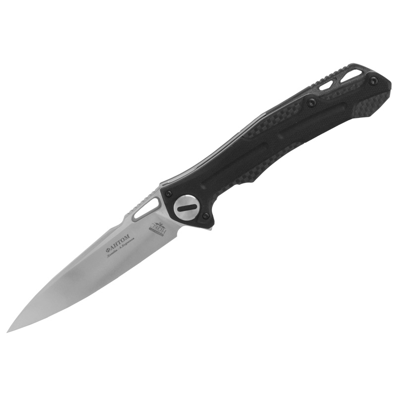 Складной нож Фантом Нокс - продолжение ножей линейки серии Т авторства Александра Бирюкова. Длинный клинок сделан из высокоуглеродистой инструментальной легированной стали Д2. Обратите внимание на его форму, так называемый «тройной клин». Во всех трех проекциях он представляет собой треугольник и это неспроста, подобная геометрия оптимально сочетает отличные режущие свойства и возможность нанести мощный акцентированный укол. «Тройной клин» был проверен и прекрасно зарекомендовал себя на уже получившем широкую известность ноже «Майор». «Фантом» стал развитием идеи, он сам по себе столь же удобен, компактен и маневренен, однако клинок стал длиннее на целый сантиметр! Осевой узел выполнен на подшипниках, благодаря этому нож с легкостью открывается одной рукой двумя способами, по выбору владельца - флиппером или при помощи отверстия на клинке.
